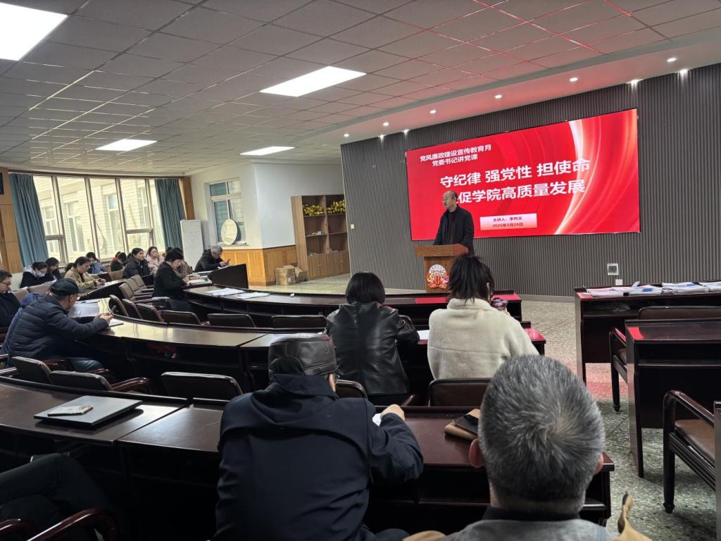 开展廉政党课,严明规矩树新风。党委书记李丙文作了题为“守纪律 强党性 担使命 共促学院高质量发展”党课,他指出,廉洁纪律是我们必须坚守的底线。我们学院的每一位教职工,尤其是掌握一定权力和资源的党员干部,都要时刻绷紧廉洁这根弦,做到公私分明,不利用职务之便谋取私利。要增强服务意识,树立以师生为中心的发展思想。党员干部要主动深入师生,了解他们的需求和困难,积极为他们排忧解难。要强化担当精神,勇于面对工作中的困难和挑战。党员干部要发挥先锋模范作用,主动承担工作任务,积极探索解决问题的方法和途径,带领全院教职工共同推动学院的发展。