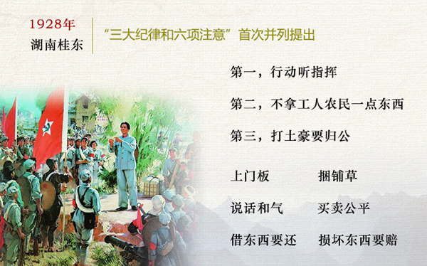 1929年1月,根据形势的发展和部队的实践经验,“六项注意”中又增加了两项:洗澡要避女人、不搜俘虏的腰包,形成了最初的“三大纪律八项注意”。