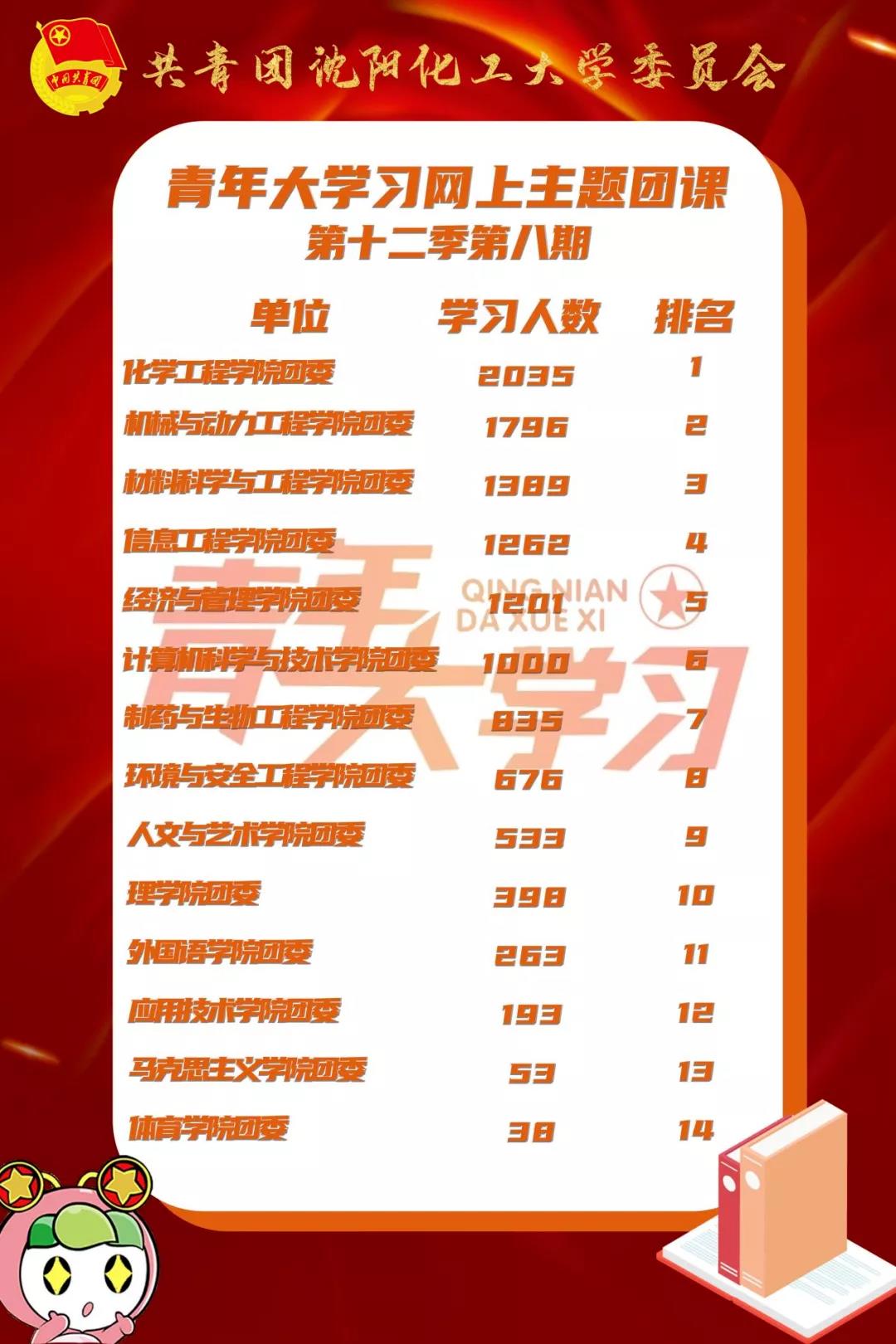 学习人数排名中,化学工程学院团委的团员学习人数达2035人,位列榜首;机械与动力工程学院团委的团员学习人数达1796人,位列第二名;材料科学与工程学院团委的团员学习人数达1389人,位列第三名。