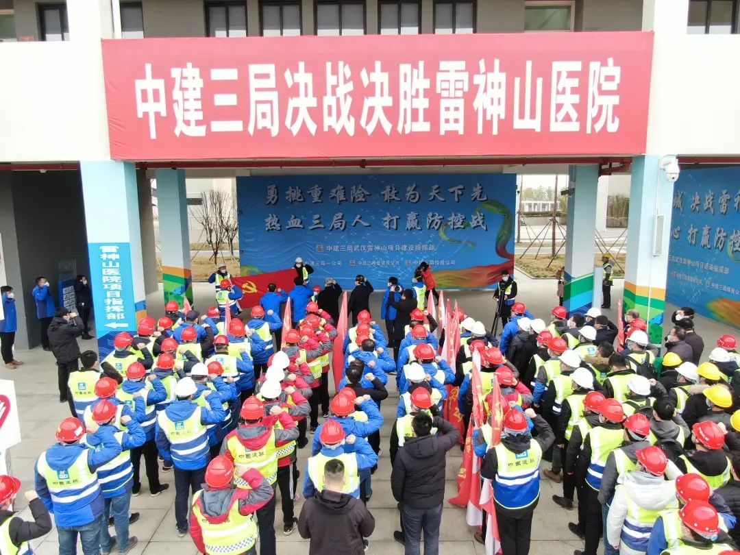 2020年1月28日,中国建筑雷神山医院项目指挥部为党员突击队、青年突击队授旗。