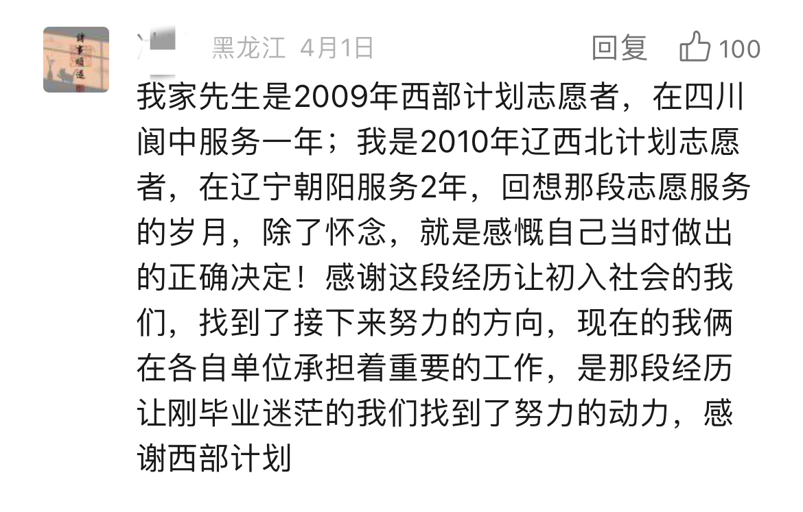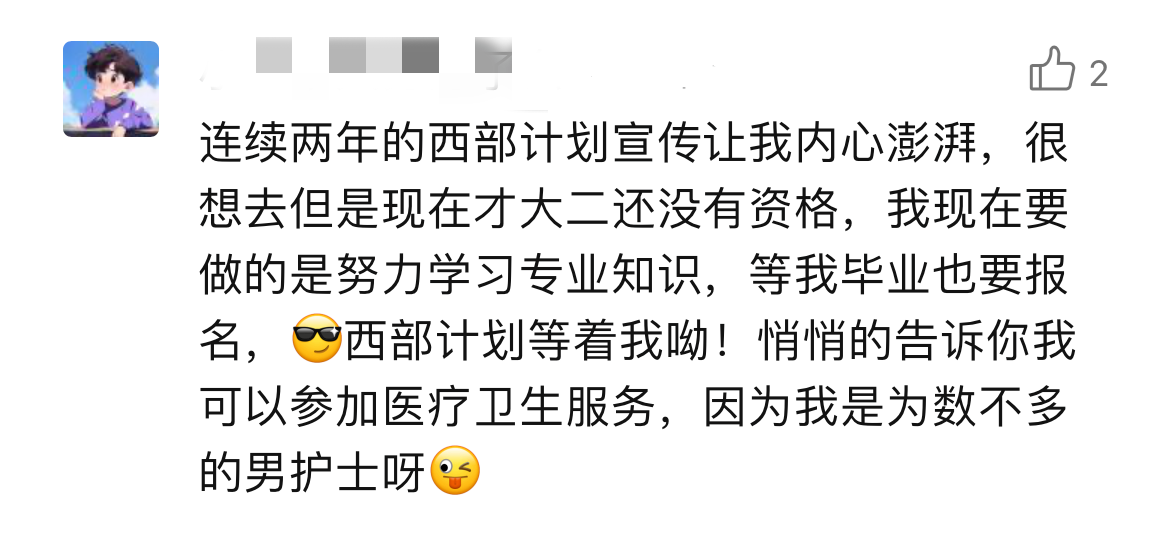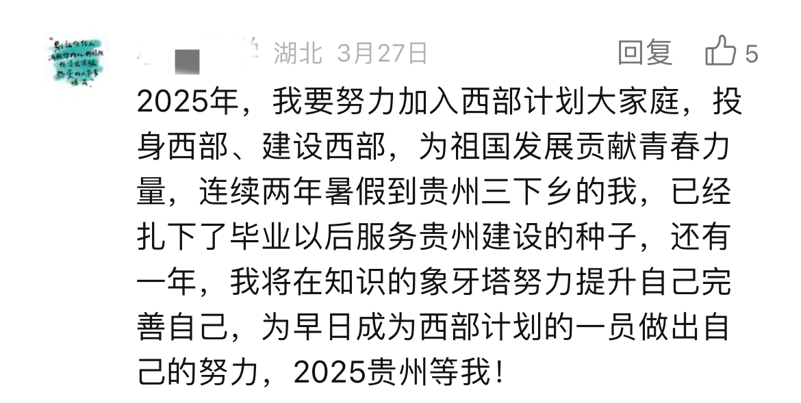 我们感动于一条条发自肺腑的留言,也欣慰于他们义无反顾的选择,更令人动容的是背后那份蓄势已久的“真行动”。“不论是四年前还是四年后,到西部去的想法不仅没变,且越来越清晰。在大学里,我积极参加志愿服务,保持综测和专业学习成绩,到基层组织学习,并光荣成为一名中共党员。付出的努力都让我更有信心和大家一起奔赴西部!”“想去,并且已经说服了爸妈,意愿服务地——西藏,两年后见”“在等毕业,也在等更优秀的自己,希望三年后能成功,西部等我”......西部计划招募对象主要为高校应届毕业生,但不少低年级的大学生朋友们早早动手,主动了解、提前谋划、持续提升,在全力以赴追逐目标的过程中,逐渐练就更加适应西部发展所需、更好在基层“乘风破浪”的“十八般武艺”,增添了更多“我能”“我行”的信心和底气,努力成长为合格的西部计划“后备军”。在离那片孕育理想的西部热土越来越近的同时,也在一步一个脚印遇见更好的自己。