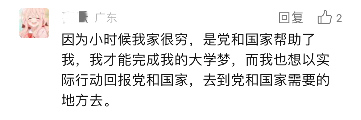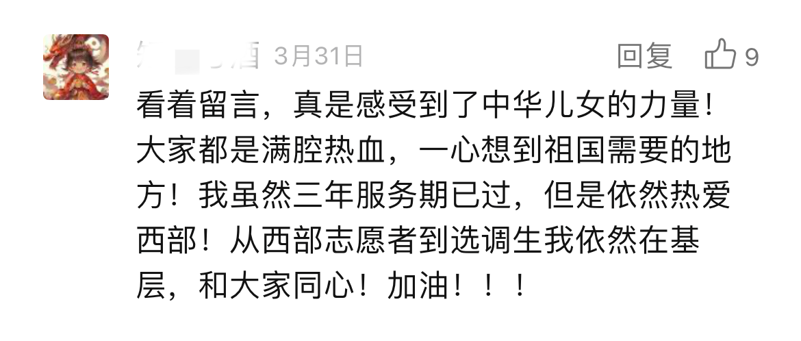 打开留言区,这群年轻人澎湃滚烫的“热情怀”溢出屏幕。“读书16年,我想是时候去做一件这样的事了。”“在党和国家的帮助下我才实现了大学梦,我也想以实际行动回报党和国家”“我的家乡就在西部,想把大山外的世界带给大山里的每一朵小花儿,给祖国的西部种满星星”……“家国所系,我之所行”。我们不难发现,这些字里行间流露出的强烈爱国情感和社会责任感,正是这群年轻人毅然决然报名西部计划的强大“源动力”。