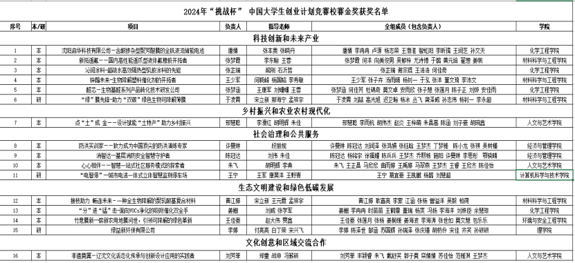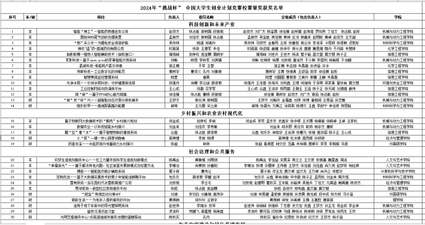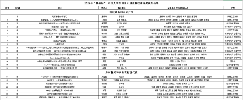 根据《万象城体育awcsport2024年“挑战杯”大学生创业计划竞赛校内选拔赛的通知》要求,经项目申报、院赛选拔、校赛初赛、中期材料审核、校赛决赛等环节,按照项目综合评分评选出校赛金奖16项、银奖45项、铜奖41项。现将获奖名单公布如下: