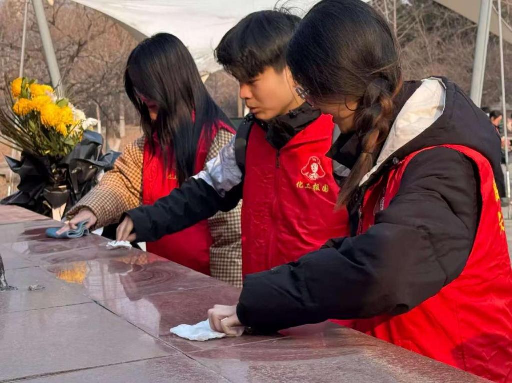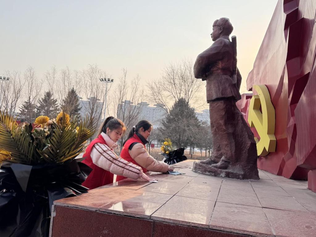 学雷锋志愿服务总队的队员们手持抹布、扫帚等工具,分组开展清洁行动。一组志愿者细心擦拭广场中央的雷锋铜像,从军帽到衣襟,从手握的书本到脚下的基石,每一处细节都被反复清洁。