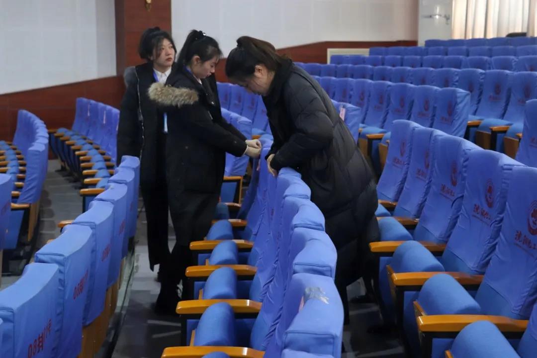 看!这是工作人员帮助布置会场桌椅,摆放桌签,一丝不苟地检查现场每一处细节。