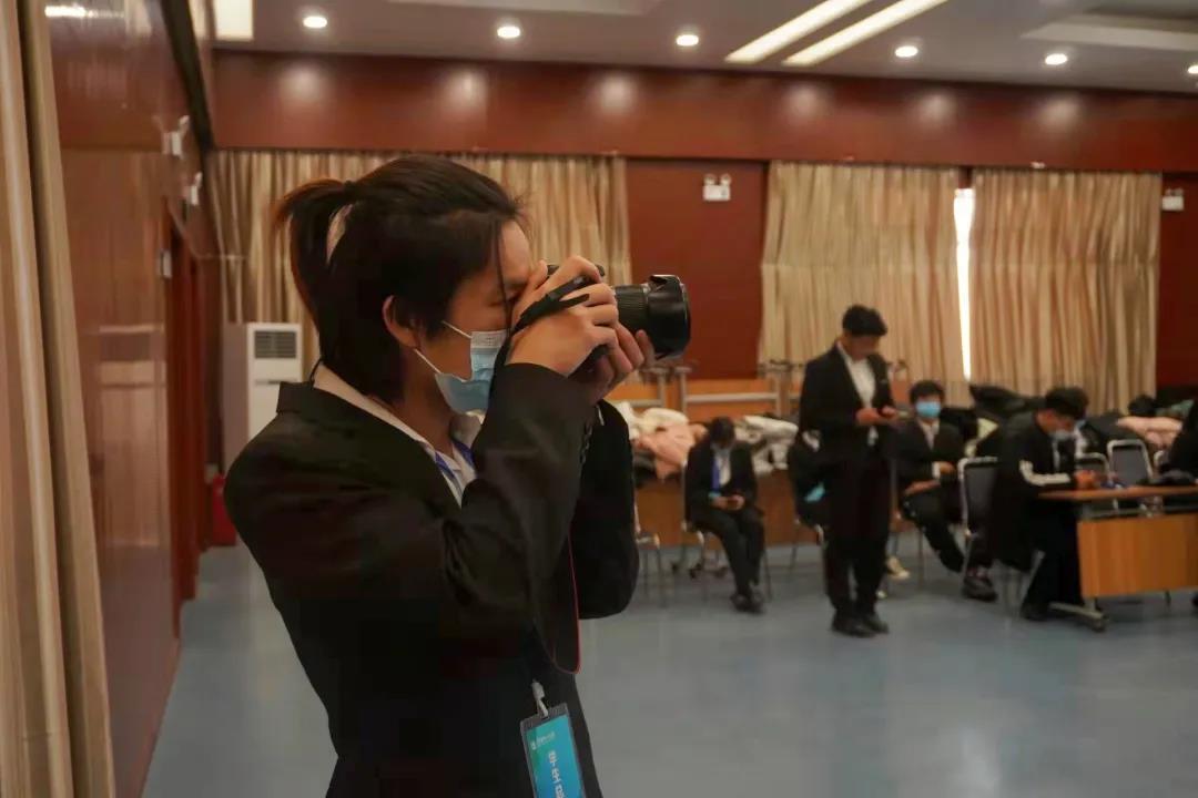 大会开始前负责摄影的工作人员集合商量拍摄素材,调试设备,找好角度,随时准备捕捉大会精彩瞬间。