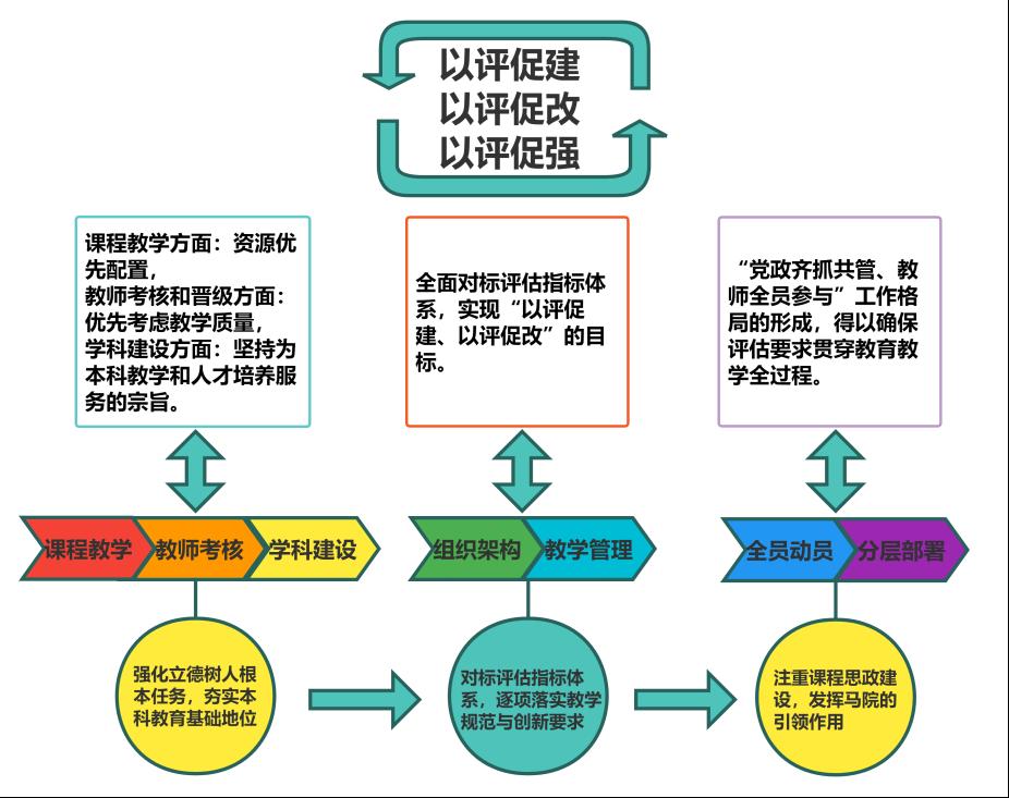 马克思主义学院始终将本科思政课教学放在基础地位,强化立德树人根本任务。一是做好思政课教学中心工作,着力培养时代新人,在课程教学方面实现资源优先配置,马克思主义学院按照教育部要求设置学时学分,设置了习近平新时代中国特色社会主义思想概论、毛泽东思想和中国特色社会主义理论体系概论、马克思主义基本原理、中国近现代史纲要、思想道德与法治、形势与政策教研室,制定了集体备课、教学效果监测评价、教师培训提升等一系列教学制度,规范教学管理,在教师岗位考核和晋职晋级方面优先考虑本科教学工作质量,在学科建设方面坚持科研与学科首先要为本科教学和人才培养服务的宗旨。二是落实教学规范与创新要求,全面对标评估指标体系。马克思主义学院通过系统化的组织架构、规范化的教学管理、多维度的质量监控及创新驱动的特色凝练,增强思政课教学效果。三是注重课程思政建设,发挥马克思主义学院在全校课程思政中的引领作用。马克思主义学院制定了思政课程与课程思政相融合的工作方案,通过全员动员、分层部署,鼓励思政教师加入专业课教师研究项目、教学团队,共同探索实践融合机制的方式方法,形成了党政齐抓共管、教师全员参与的工作格局,不断创新工作方式方法,持续提升课堂教学效果。