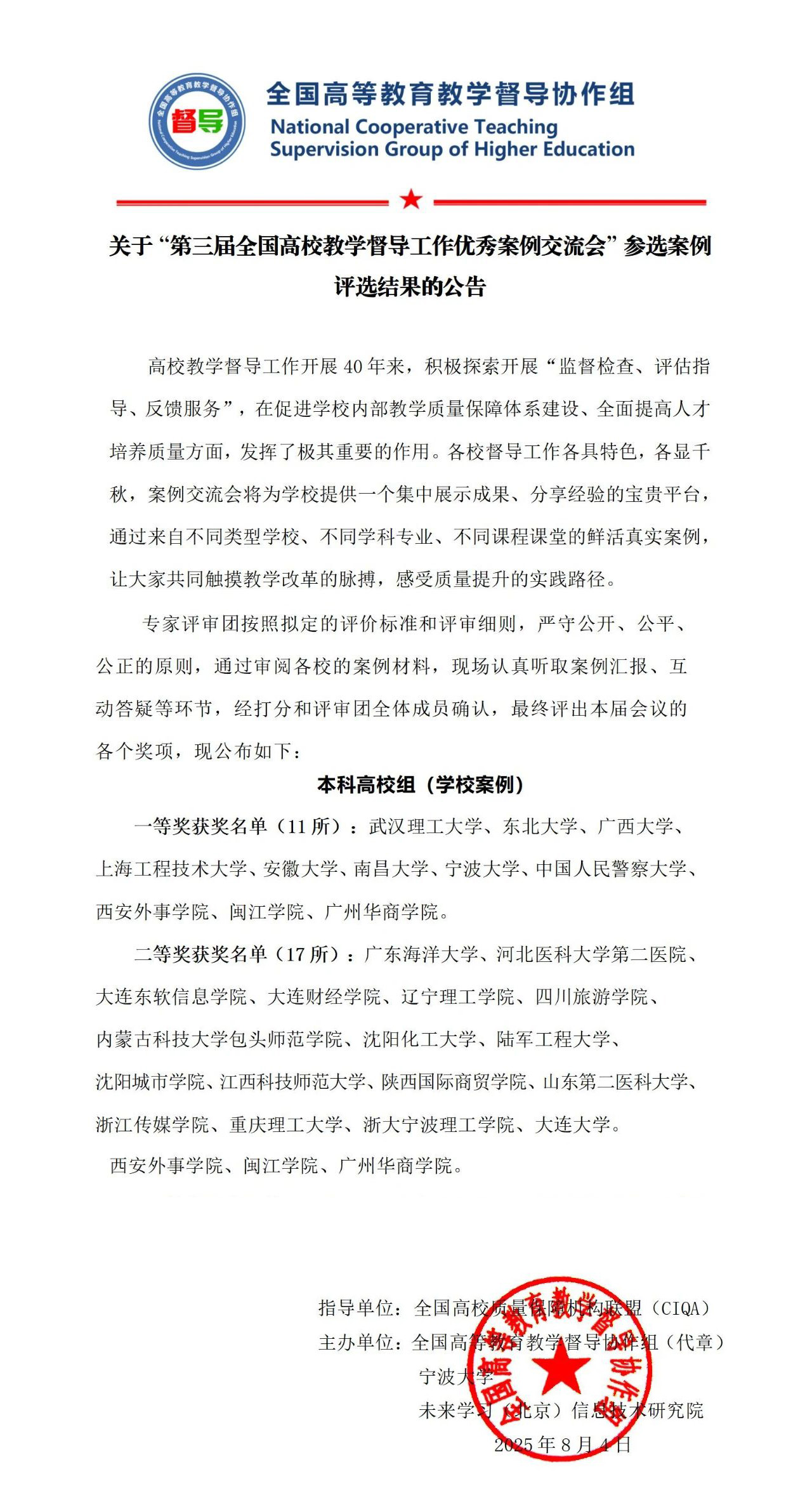 本次交流会于2025年7月25日至28日在大连举行,由全国高校质量保障机构联盟(CIQA)和全国高等教育教学督导协作组联合主办,旨在促进高校教学督导工作的经验交流与创新发展。共有100所高校参与本次案例评选,最终评选出一等奖11名、二等奖17名。万象城案例能够获得此项成绩,体现了学校在教育教学质量保障体系建设方面取得了一定成效。