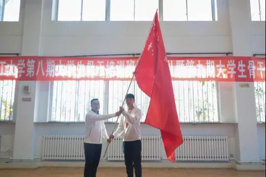 来自第九期全体学员代表陈天钰表达了对学校举办大学生骨干培训班的感谢,同时也坚定了新学员们不负重托,不辱使命,勇担责任,向着梦想不懈奋斗的决心和信念。由校团委书记战申为第九期学员授旗。