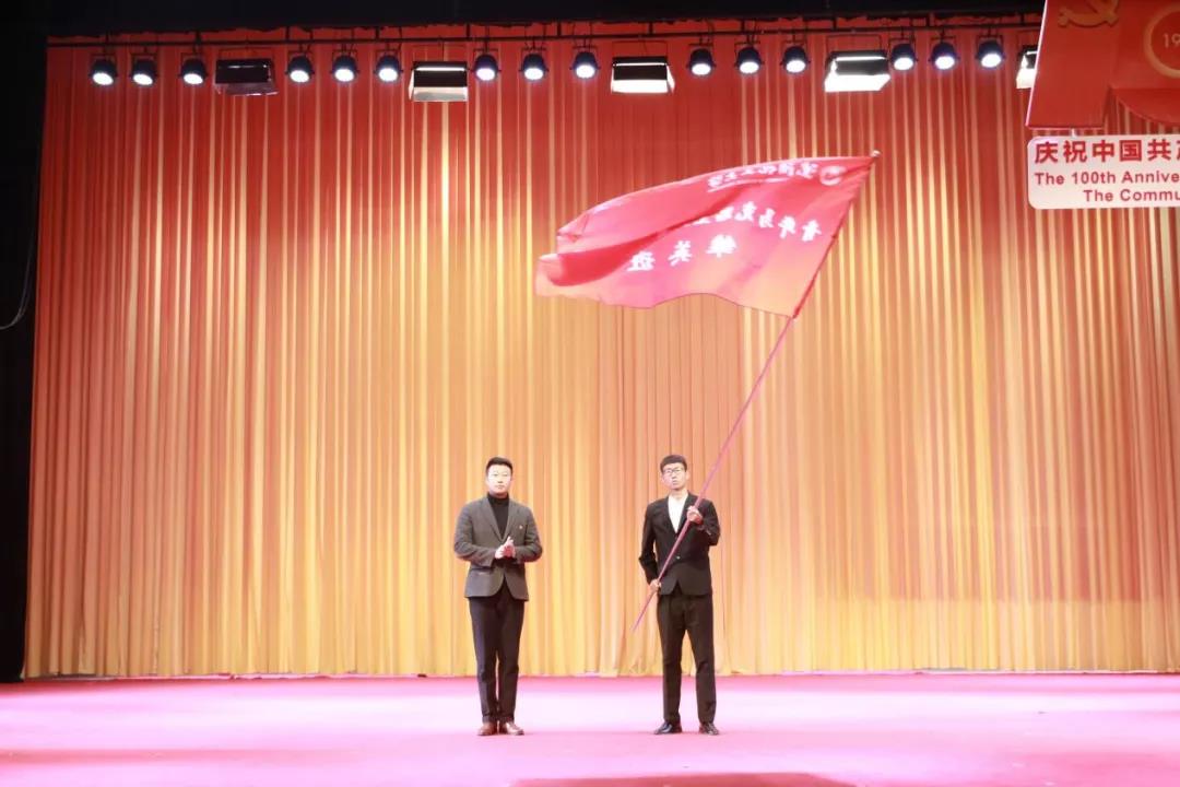 丁毓峰老师为第六期雏英班授旗,第六期学员代表接旗。